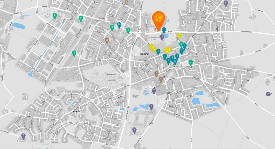 Aktive kommen in Willich voll auf Ihre Kosten: Vom Bolz- bis zum Tennisplatz, vom Golf- bis zum Reitsport, vom Freizeitbad „De Bütt“ bis zum breit gefächerten Vereinswesen – es gibt viel zu entdecken. Auch das facettenreiche Angebot an Gastronomie, Kunst und Kultur weiß zu überzeugen. Gourmets können sich über die vielfältige Restaurantlandschaft freuen, Kunst- und Kulturfreunde genießen das reichhaltige Kulturprogramm, das von Konzerten über Kleinkunst bis zu den Schlossfestspielen Neersen jeden Geschmack bedient. Hinzu kommt eine lebendige Innenstadt, die zum Bummeln, Shoppen in der Lieblingsboutique oder einem Cappuccino beim Italiener um die Ecke einlädt.